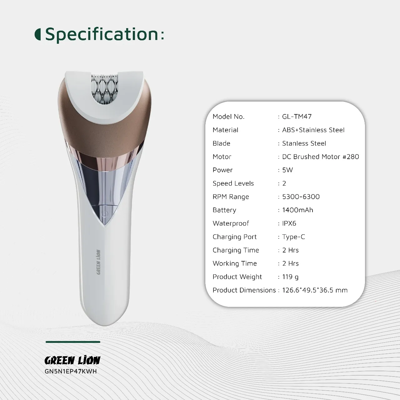 کیت اپیلاتور بیسیم گرین لاین مدل GN5N1EP47KWH ۵ کاره