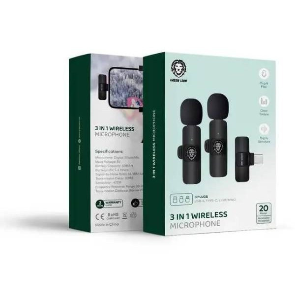 میکروفون بیسیم گرین مدل GN3WIRMICP با ظاهری شیک و ابعادی بسیار کوچک طراحی شده که مثل هندزفری بلوتوثی نیز میتوانید آن را درون جیب یا کیف خود قرار دهید . شارژی و بیسیم بودن آن به شما این امکان را میدهد که به راحتی در فضای بسته و فضای باز آن را استفاده کنید .اگر در زمینه تولید محتوا ، تهیه پکیجهای آموزشی و یا کلاس های آنلاین فعالیت دارید ، میکروفون یکی از تجهیزات ضروری محسوب میشود . این محصول دارای 2 عدد میکروفون است که برای مصاحبههای 2 نفره نیز میتوانید از آن استفاده کنید .به صورت گیرهای طراحی شده که میتوانید آن را به یقه یا هر قسمتی از لباس وصل کنید .مجهز به استفاده آسان Plug و Play و جفت شدن خودکار است و تا 20 متر میتوانید از موبایل نیز فاصله بگیرید .ظرفیت باتری میکروفونها 60 میلی آمپر است و حدود 5 تا 6 ساعت شارژدهی دارد .رابط ورودی میکروفون نیز به صورت Type-C طراحی شده و علاوه بر آن درون جعبه رابط های Lightning و USB-A قرار دارد .هنگام اتصال گیرنده به موبایل نیز همزمان میتوانید گیرنده را به کابل شارژ متصل کنید .