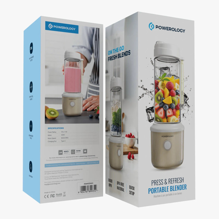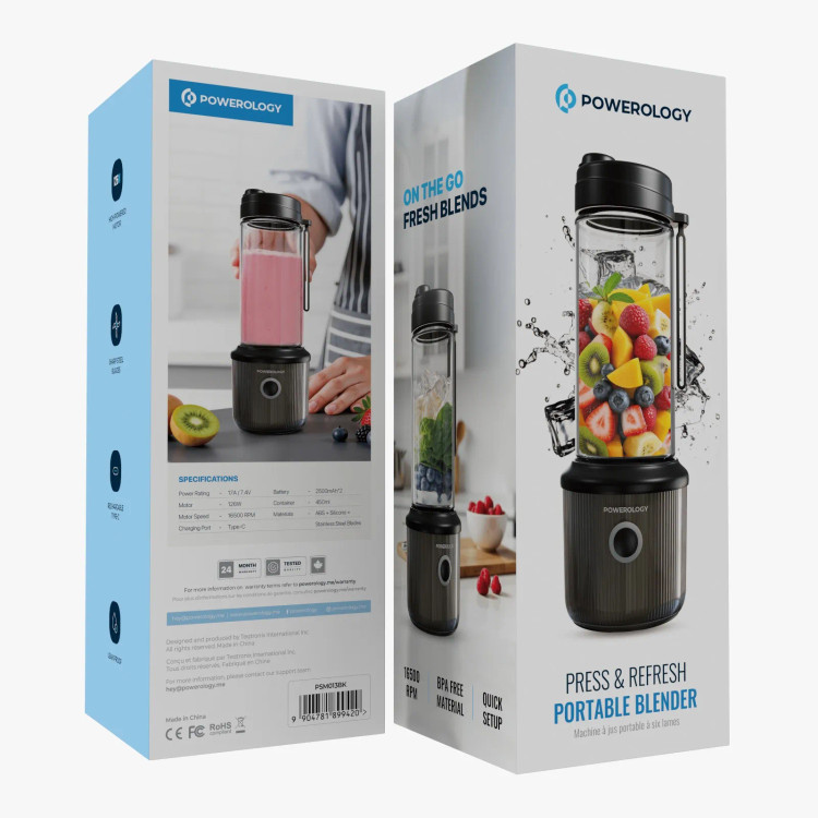 بلندر قابل حمل Powerology مدل Press & Refresh یک دستگاه قدرتمند و جمعوجور برای تهیه نوشیدنیهای سالم در هر مکان و زمانی است. با طراحی ارگونومیک، این مخلوطکن همراه، مناسب برای افرادی است که بهدنبال سبک زندگی سالم و سریع هستند؛ چه در خانه، چه در محل کار یا در باشگاه ورزشی.