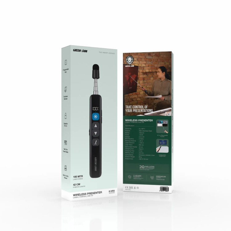 پرزنتربیسیم گرین لاین یک ابزار فوقالعاده است که به شما کمک میکند تا ارائه ای مجذوب کننده را داشته باشید. این محصول فوقالعاده بی سیم به شما کمک میکند تا ارائه ای بدون وقفه داشته باشید. سایز این محصول 42 سانتی متر است و در حمل آن به هیچ مشکلی نخواهید خورد. این پرزنتر محصولی عالی برای کنفرانس های کاری، مدرسه، آموزش و شرکت هاست. هفت کلید قابل برنامه ریزی آن به شما کمک میکند تا سرعت ناو بری اسلاید صدا و دیگر تنظیمات را تغییر دهید. همچنین یک صفحه نمایش کوچک نیز روی این محصول قرار گرفته است تا به کمک آن بتوانید شارژ دستگاه و دیگر اطلاعات مهم را مشاهده کنید. با کمک کانکتور type-C میتوانید باتری 180 میلی متری آن را در 2 ساعت شارژ و تا 6 الی 8 ساعت از آن استفاده مداوم داشه باشید. این نشانگر لیزری با کمک ارتباط رادیویی 2.4 گیگاهرتزی تا 20 متر فرمان میگیرد و لیزر آن تا شعاغ صد متر را به راحتی میپیماید. نور لیزر 650 نانومتری یک نشانگر قوی و قابل مشاهده ارائه می دهد. وزن کم، لیزر قوی و صفحه نمایش این محصول، آن را به انتخابی عالی برای علاقه مندان تبدیل میکند.