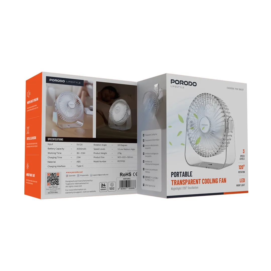سبک اما مقاوم، بادوام و ساخته شده از مواد ABS قوی است. با پنکه خنککننده شفاف قابل حمل Porodo Lifestyle، روز و شب از خنکی و راحتی لذت ببرید.