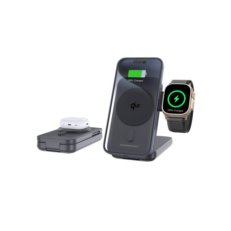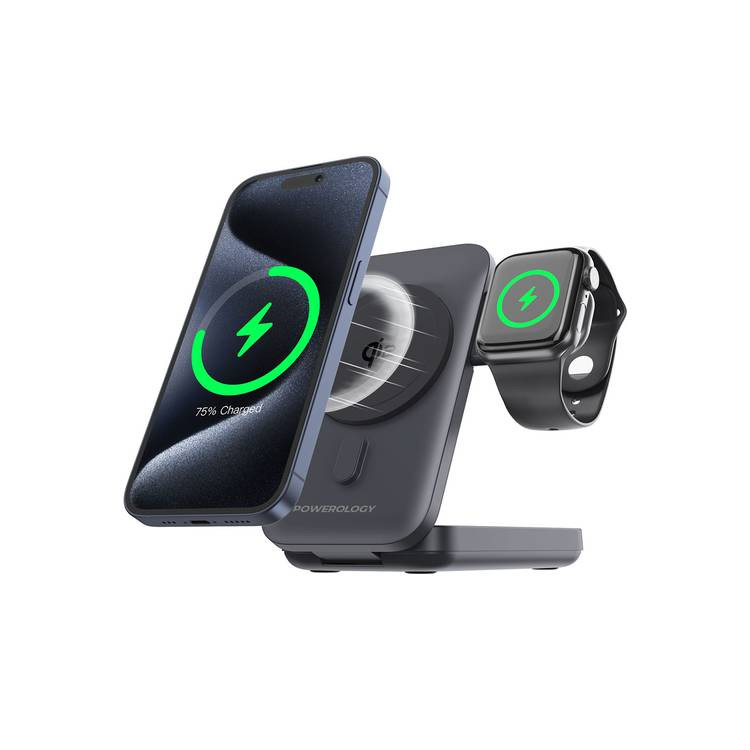 شارژر پاورولوژی PPBCHA35-BK با پشتیبانی از شارژ وایرلس آیفون، اپل واچ و ایرپادز نیاز شما را از داشتن شارژرهای مختلف برای محصولات اپل بینیاز می کند. توان خروجی برای شارژ تلفن همراه حداکثر 15 وات و برای ساعت حداکثر 3 وات است.