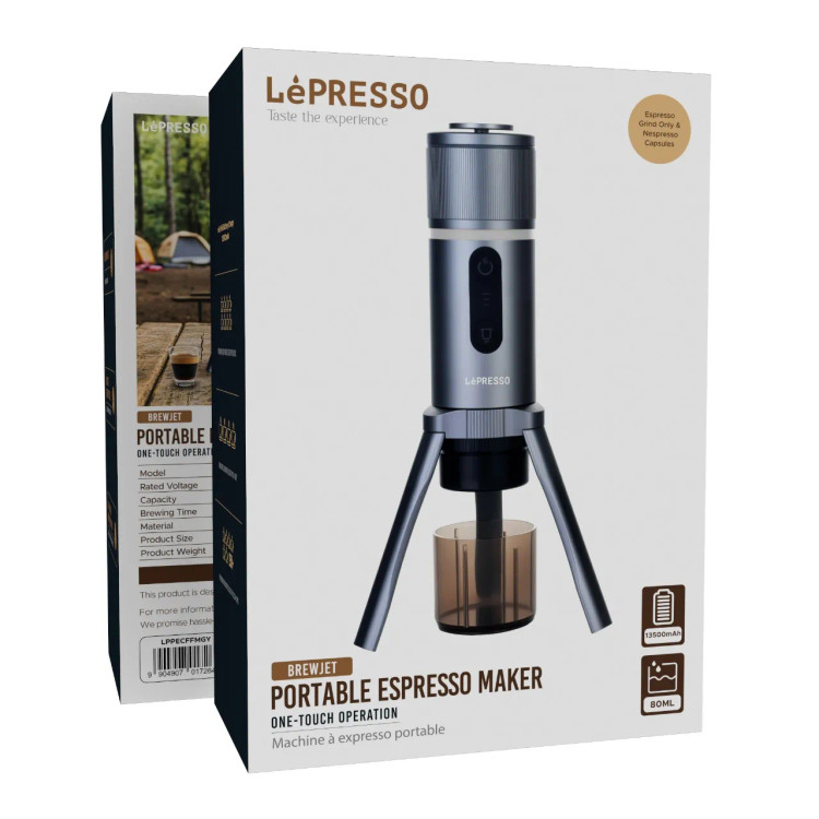 اسپرسوساز پرتابل لپرسو LePresso BrewJet با فشار واقعی ۱۸ بار و قابلیت استفاده از کپسول یا پودر قهوه، با ظرفیت بالا و قابلیت شارژ از طریق ۱۲ ولت (خودرو) و ۲۲۰ ولت (برق شهری)، به شما اجازه میدهد در سفر، محل کار یا طبیعت، بدون وابستگی به پریز برق ثابت، اسپرسوی ایدهآل خود را تهیه کنید.