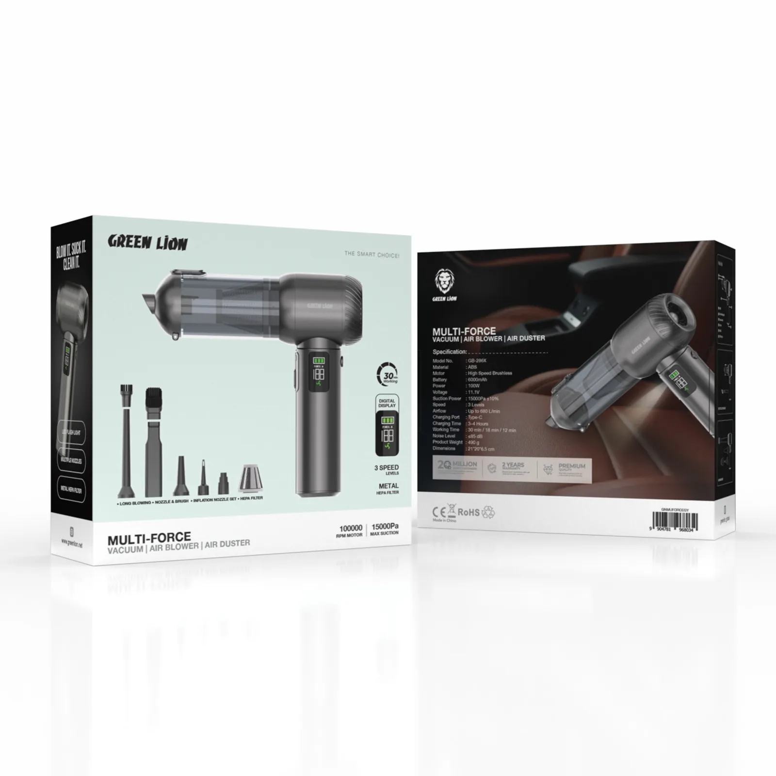Green Lion Multi-Force یک جارو شارژی پرقدرت با قابلیت همزمان دمندگی و مکندگی است که با موتور براشلس پرسرعت، مناسب تمیزکاری داخل خودرو، خانه، محیط کار و تجهیزات الکترونیکی میباشد. این مدل با قدرت مکش بالا و باتری ظرفیتبالا طراحی شده تا کارکرد طولانی، قدرت پایدار و سروصدای کم ارائه دهد.